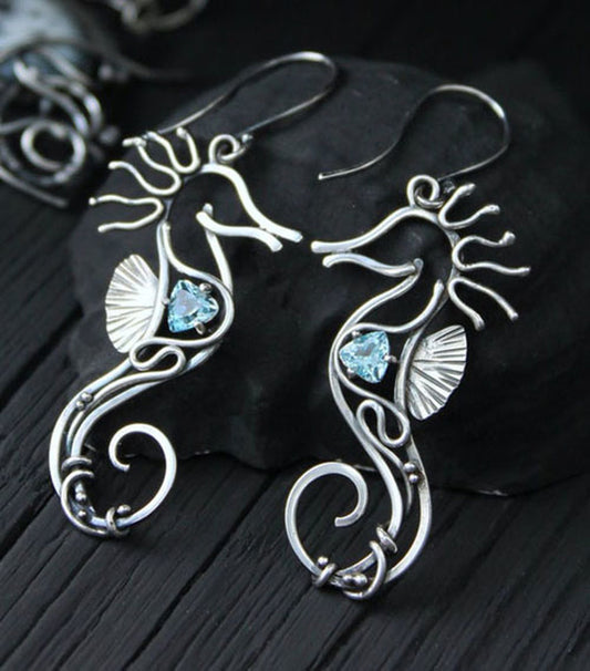 Women's Fashion Vintage Ocean Blue Gemstone Hollow Seahorse Earrings