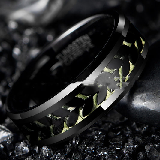8mm Wide Inlaid Leaves Pattern Green Carbon Fiber Men's Tungsten Ring