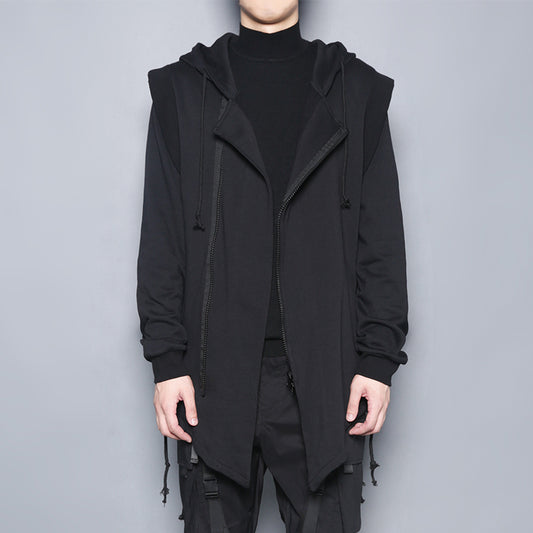 Dark Black Zipper Hooded Cross Strap Casual Coat