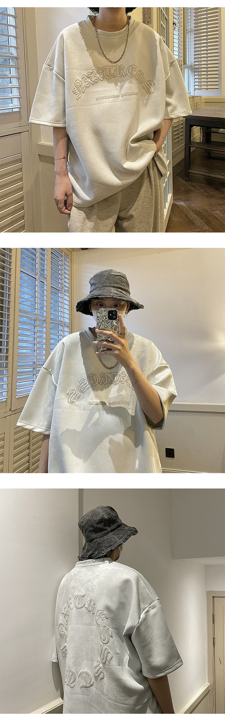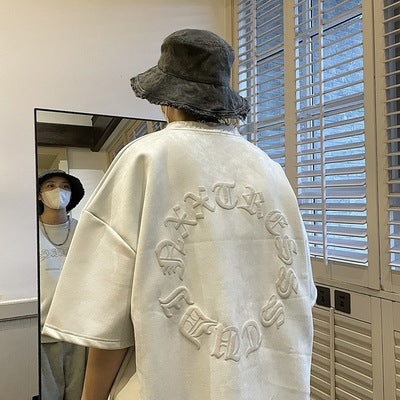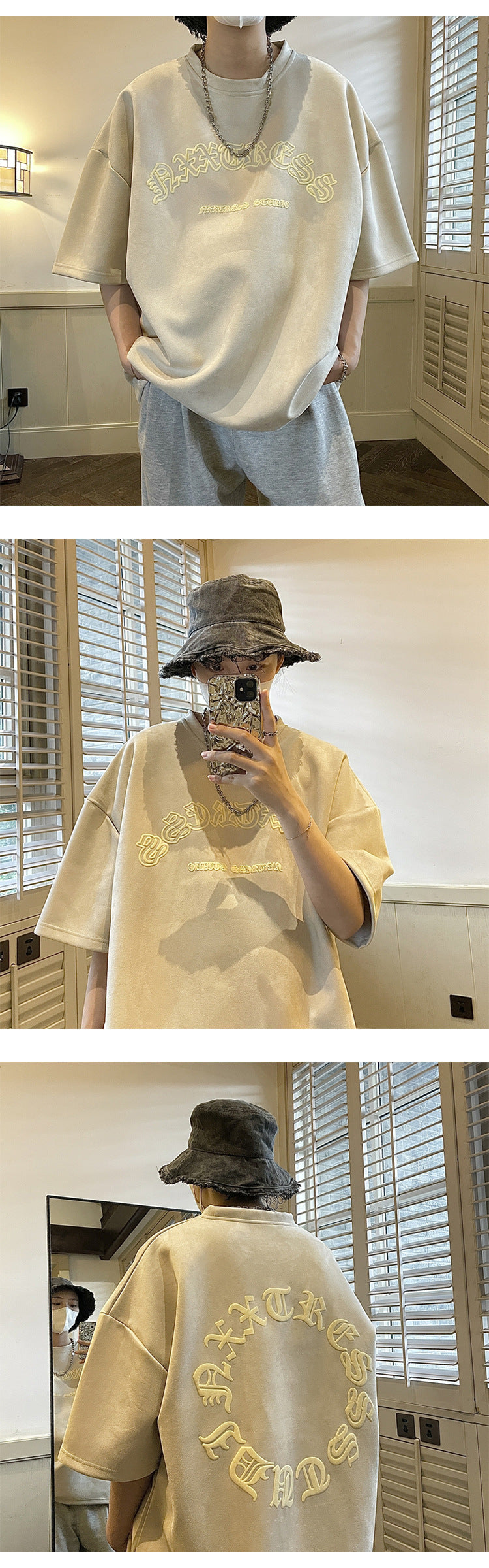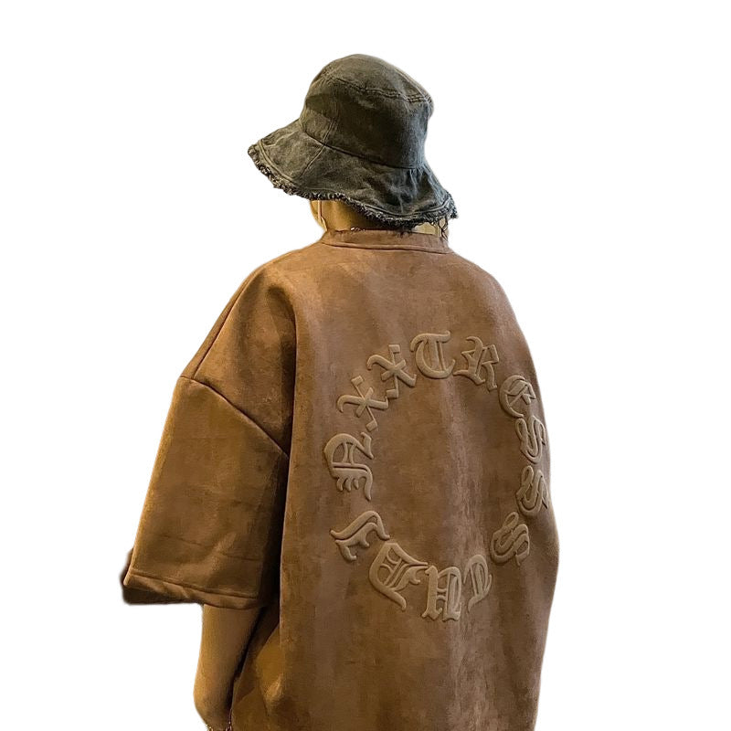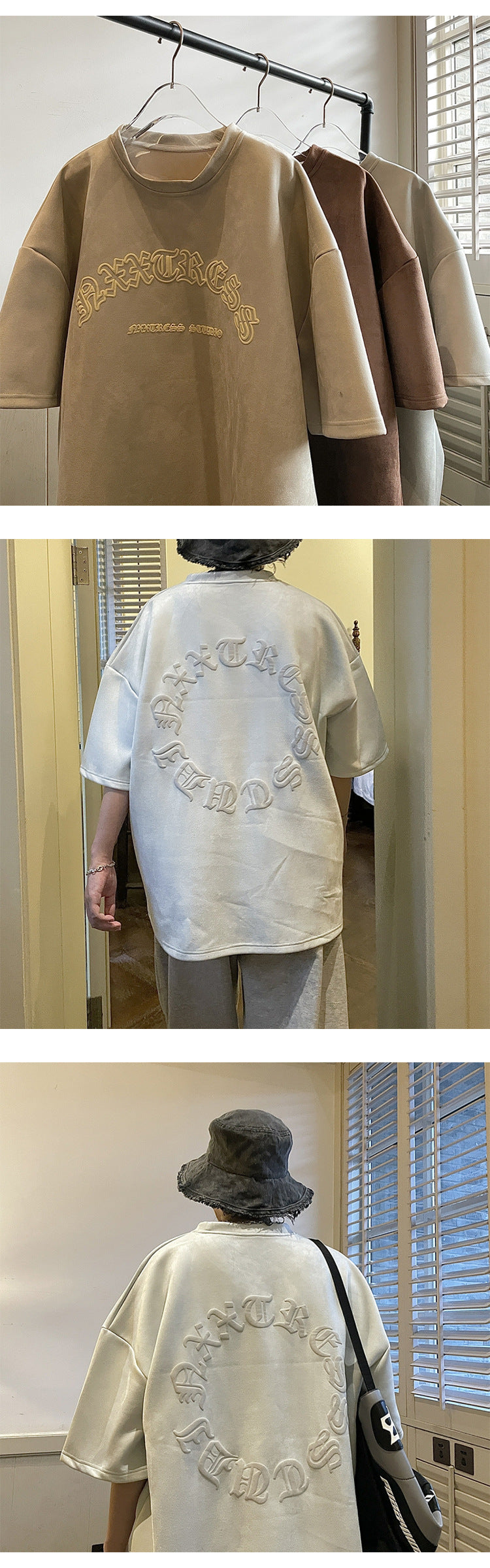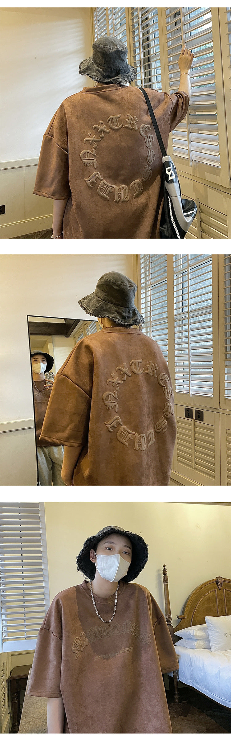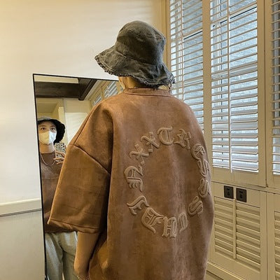 American Style Puff Print Suede Short Sleeve Retro Brown Heavy T-shirt