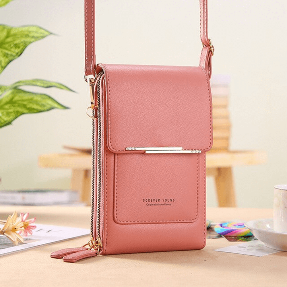 Bag made with PU leather material, with internal dividers and touch-sensitive space to use the cell phone.