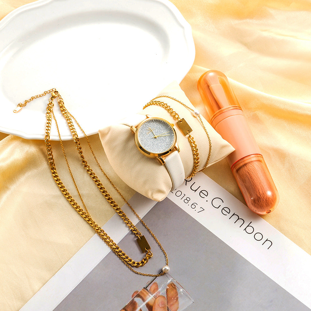 Quartz Watch Ladies Necklace PU Watch Titanium Steel Bracelet Makeup Brush 4-piece Gift Box
